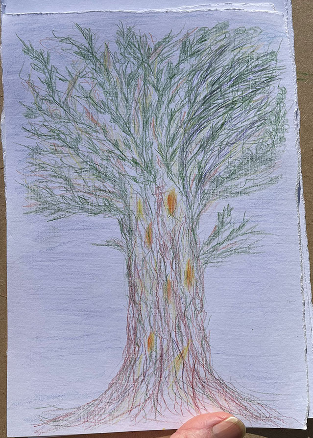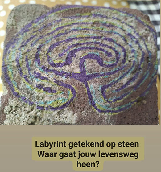 Piet schrijft: Nu op de Walcherse camping labyrinten op steen aan het tekenen als een meditatie in stilte tussen vogelgeluiden.