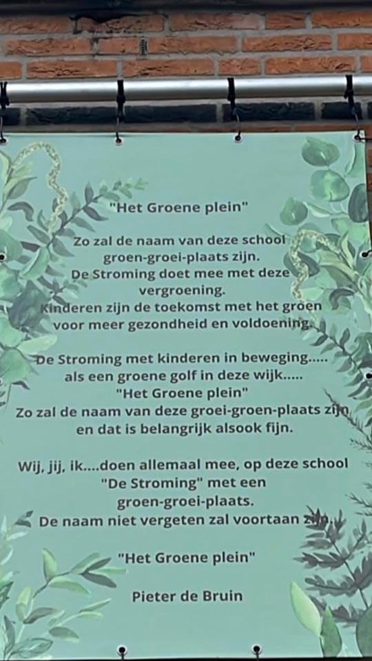 Piet schrijft: Hierbij mijn juli-gedicht dat vorige week is opgehangen bij de basisschool in de Stromenwijk waar ik woon. Dit ivm de vergroening van het schoolplein.