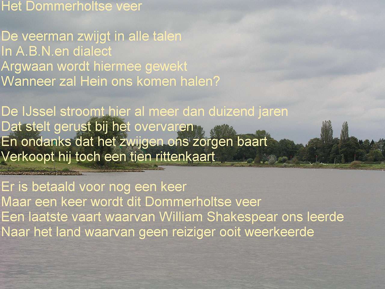 Harmen schrijft: Het gaat over het voetgangers pontje tussen Gorssel en Wilp, het Dommerholtse veer dat alleen in de zomer vaart. De eerste keer dat ik het pontje nam samen met mijn broer die in Gorssel woont, had iets onheilspellend. Het deed me denken aan het oversteken van de Styx. Een verhaal uit de Griekse oudheid.