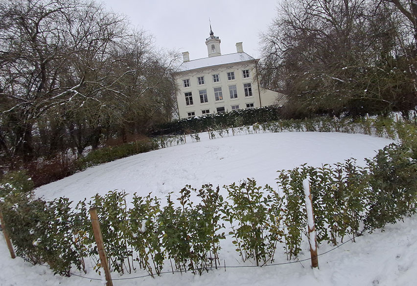 snel gelegd door gestaag vallende sneeuwvlokken wijd en zijd.Nu tijdelijk opvallend als openluchtpodiumlabyrint
